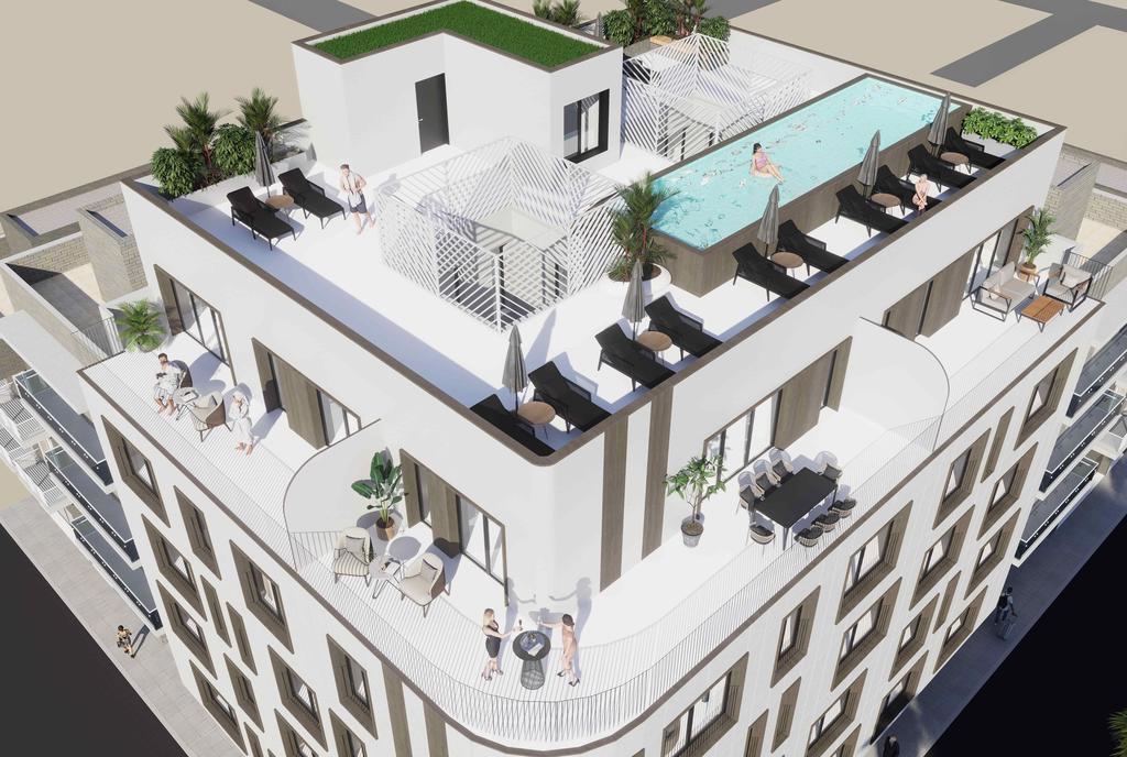 Varje lägenhet har rymliga balkonger för att njuta av solen och utsikten. På taket finns en gemensam terrass med pool och avkopplande loungeområden – idealiskt för att koppla av, umgås och njuta av den spanska solen.