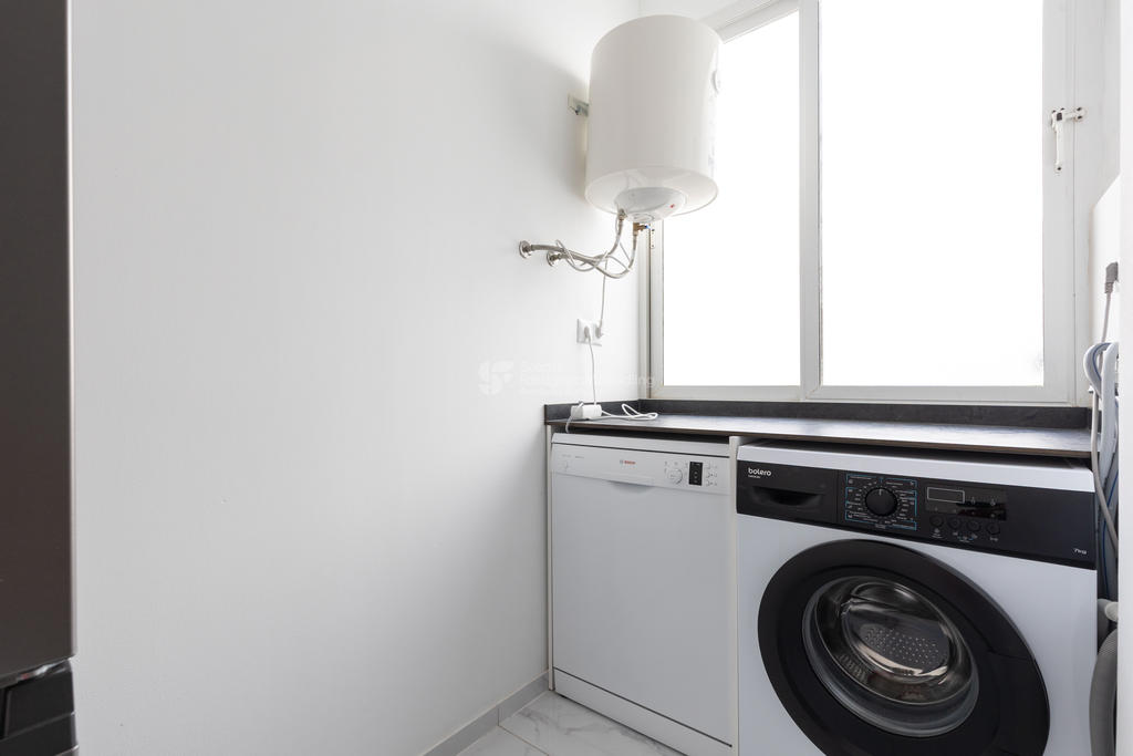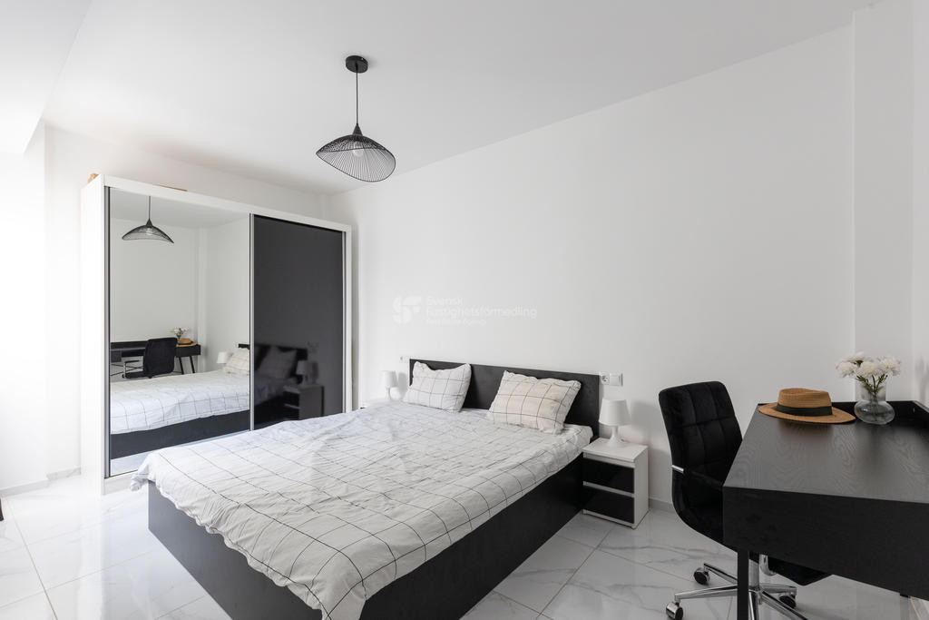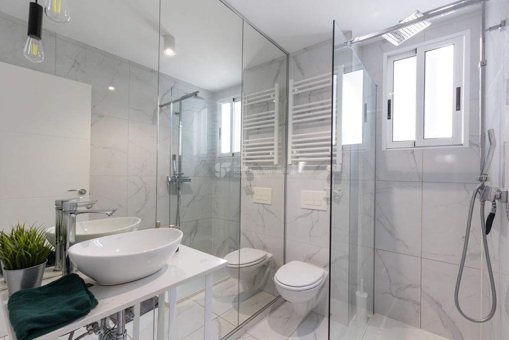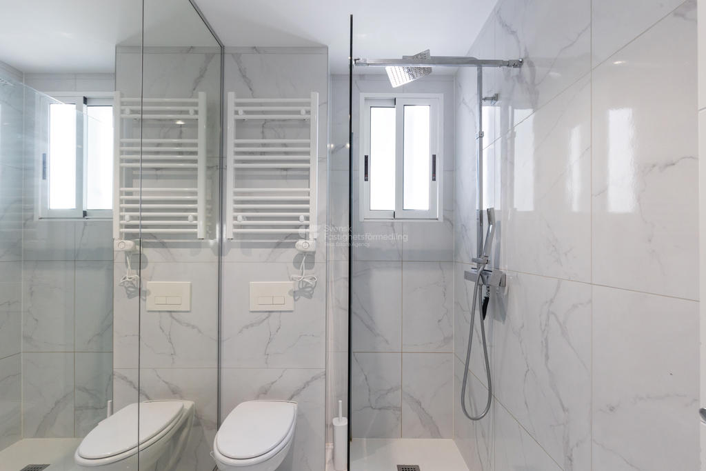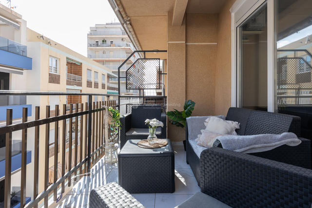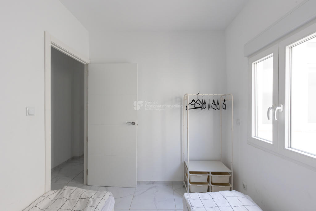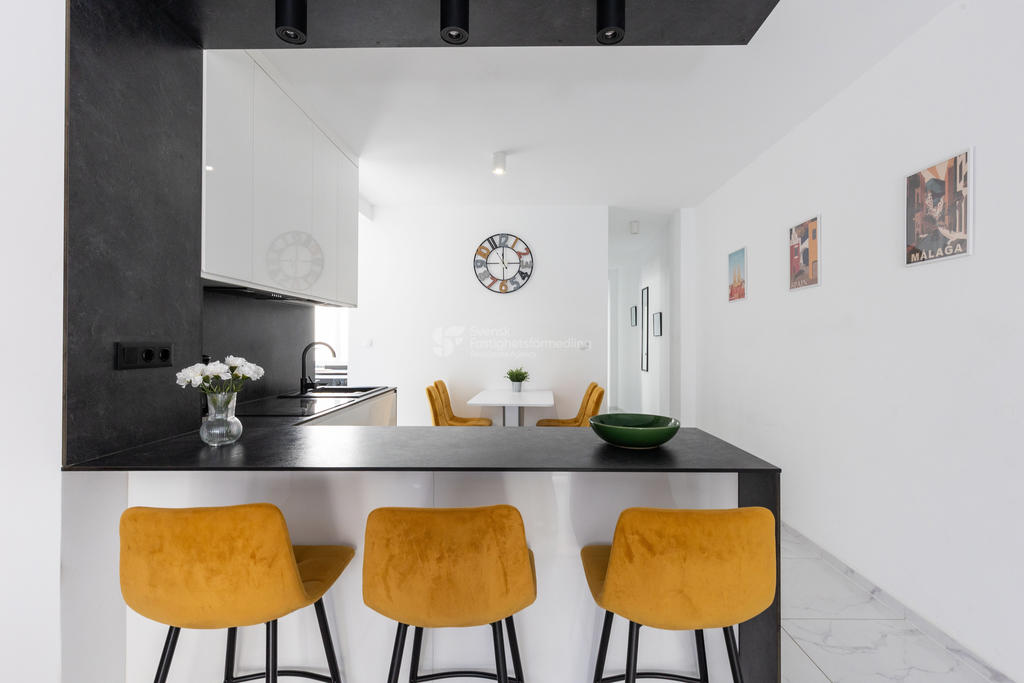 Från vardagsrummet når du den rymliga balkongen, en perfekt plats att njuta av det spanska klimatet. Här kan du starta dagen med en kopp kaffe i morgonsolen eller avsluta kvällen med ett glas vin medan stadens liv pulserar nedanför. Från balkongen skymtar även havet, vilket ger en extra känsla av närheten till stranden.