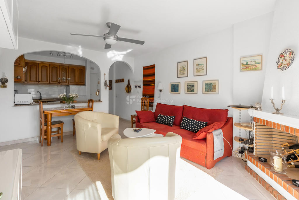 Lägenheten har ett ljust vardagsrum med en öppen spis. Från vardagsrummet kommer man ut till balkongen där man har en fin vy över havet. Köket har en öppen planlösning mot vardagsrummet, vilket skapar en social yta. Vidare finns ett sovrum, ett badrum samt ett praktiskt förråd under trappan.