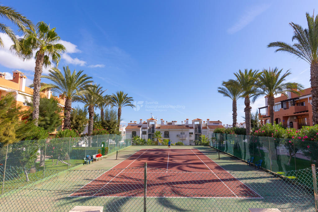 Bostaden är belägen i ett inhägnat område med en trivsam miljö. Som boende har du tillgång till ett gemensamt poolområde och en tennisplan. Till lägenheten hör även en egen garageplats under mark, vilket gör parkeringen bekväm.
