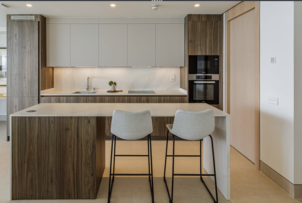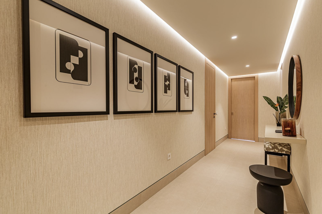 The apartment is sold fully furnished and offers a well-designed layout comprising an elegant entrance hall with guest bathroom, a bright open-plan living and dining area, and a fully equipped Gunni & Trentino kitchen with Miele appliances. A standout feature is the 44 m² south-facing covered terrace, ideal for outdoor living while enjoying uninterrupted sea views.