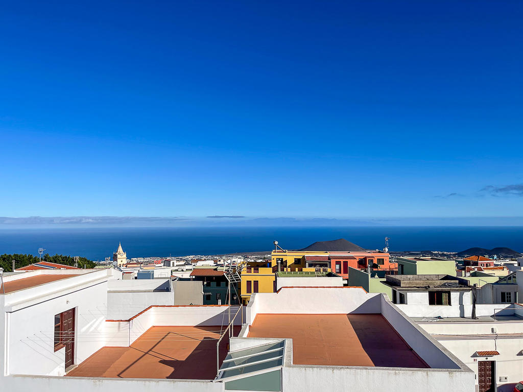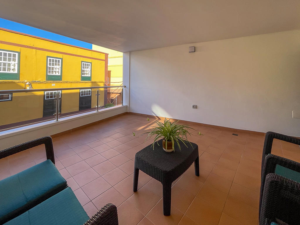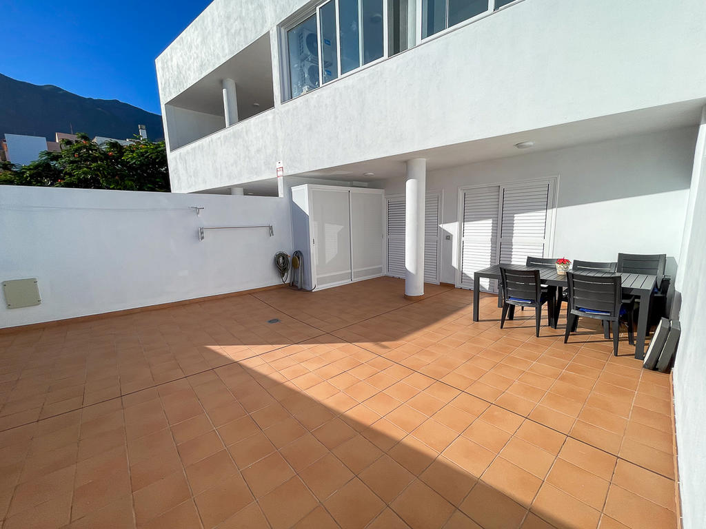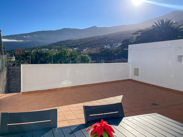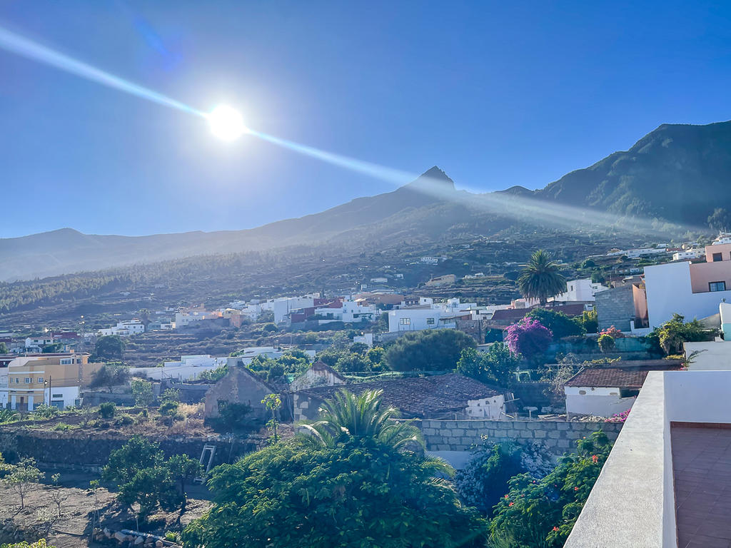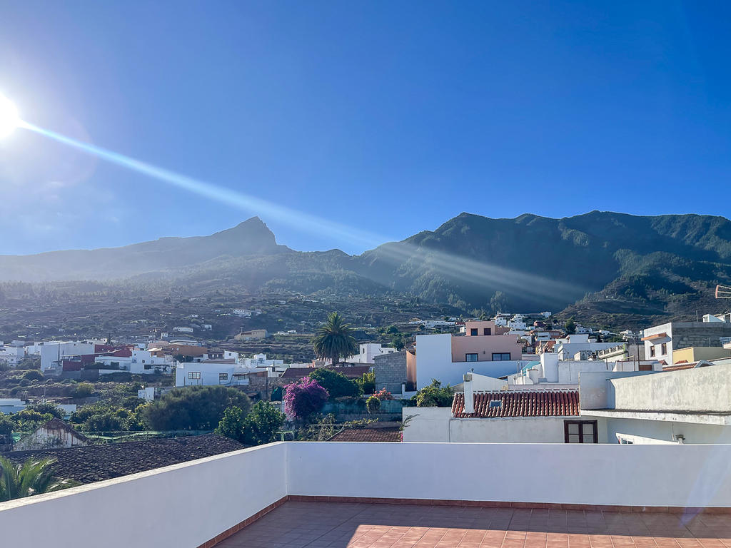Från vardagsrummet leder de stora glaspartierna ut mot en rymlig, skuggig terrass med utsikt mot de traditionella kanariska husen i grannskapet och de mäktiga bergen i bakgrunden.