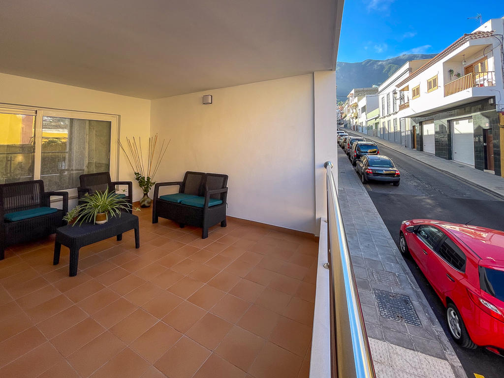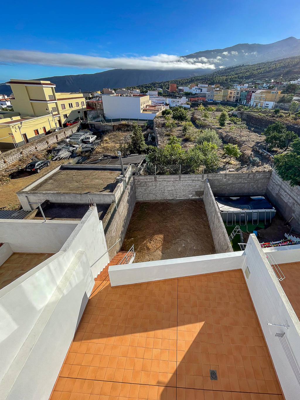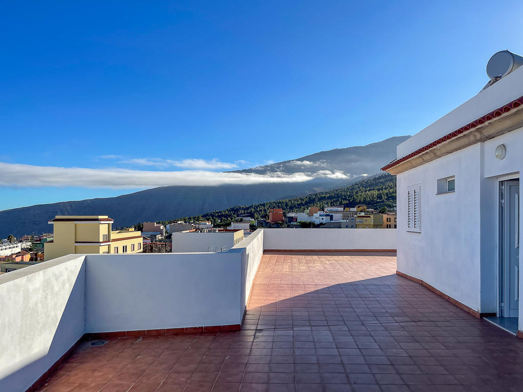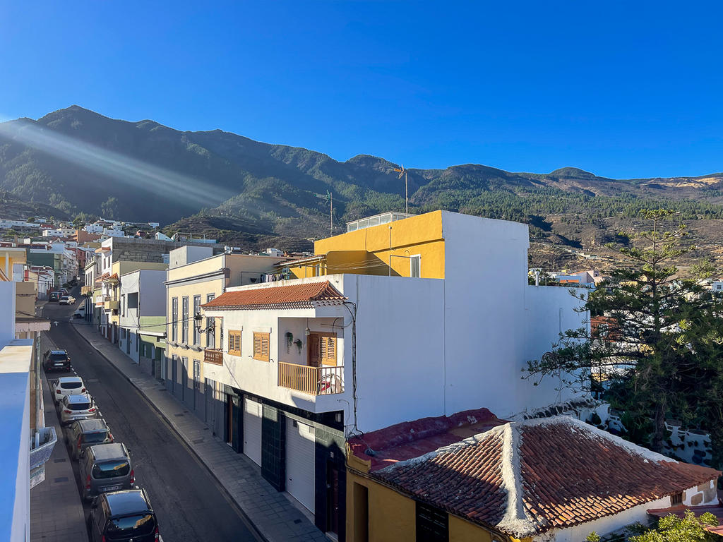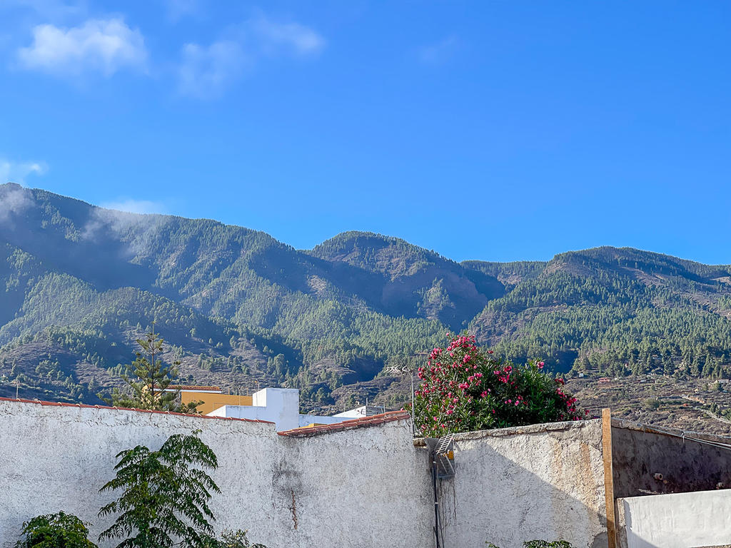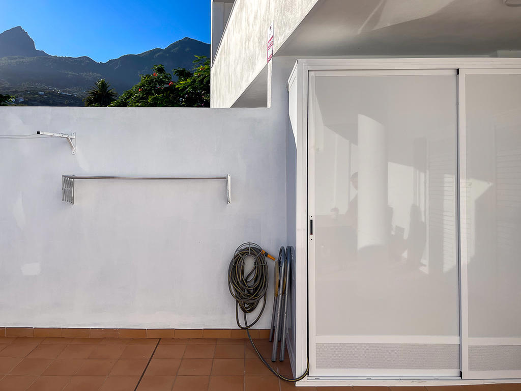 Från vardagsrummet leder de stora glaspartierna ut mot en rymlig, skuggig terrass med utsikt mot de traditionella kanariska husen i grannskapet och de mäktiga bergen i bakgrunden.