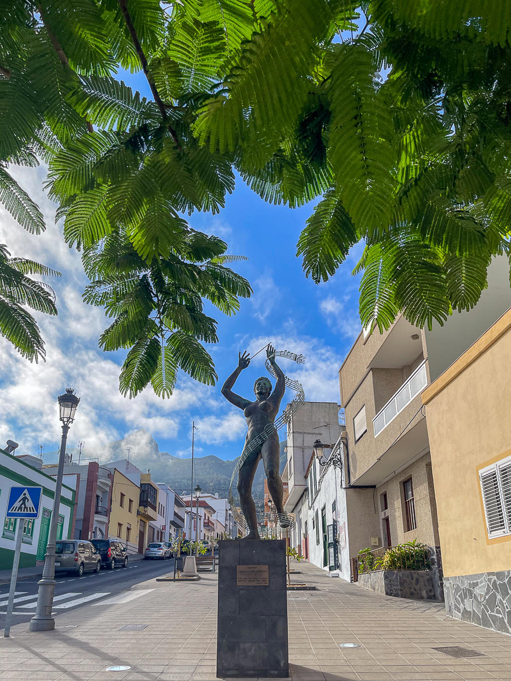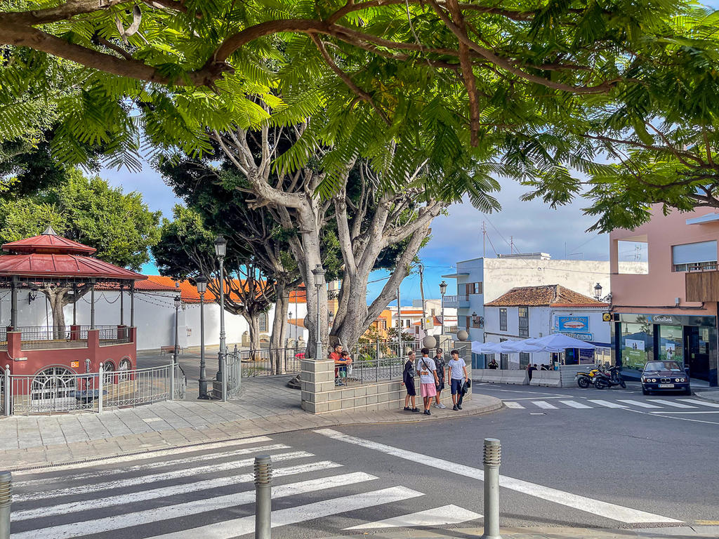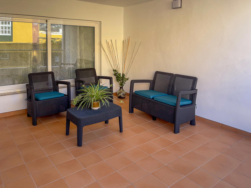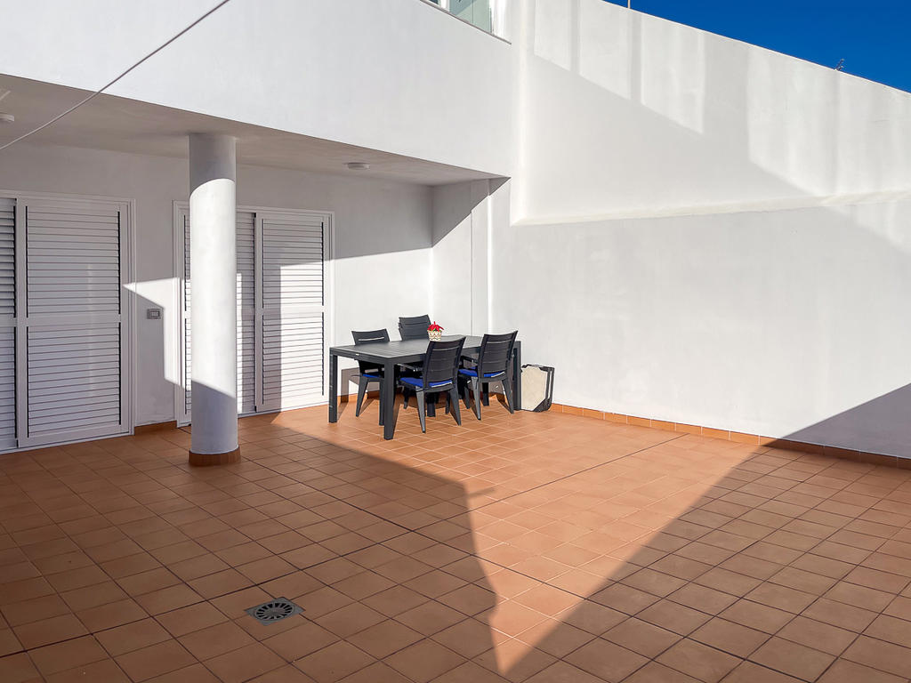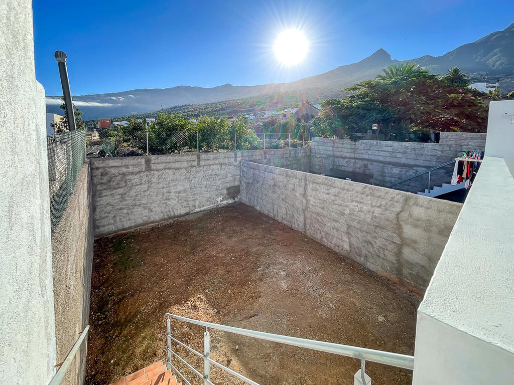 Från vardagsrummet leder de stora glaspartierna ut mot en rymlig, skuggig terrass med utsikt mot de traditionella kanariska husen i grannskapet och de mäktiga bergen i bakgrunden.