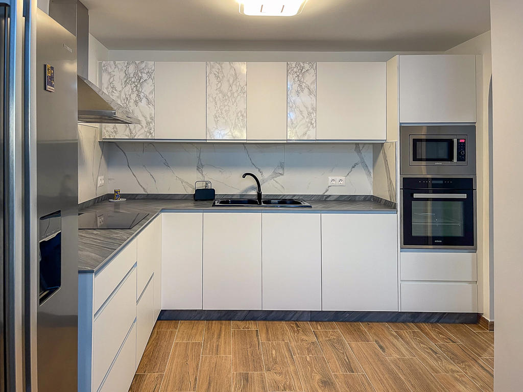 Bostaden erbjuder en genomtänkt planlösning, här är öppet mellan kök och vardagsrum, och här finns generösa ytor och stora skjutdörrar som släpper in rikligt med ljus. Allt är nytt och fräscht med hög standard i både materialval och utförande.