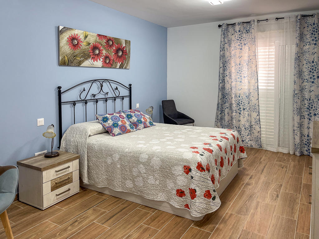 Båda de ljusa sovrummen har inbyggda garderober samt skjutdörrar ut mot den stora familjeterrassen, på över 40 m². Här njuter du av sol från morgon till kväll och fri utsikt över bergen.