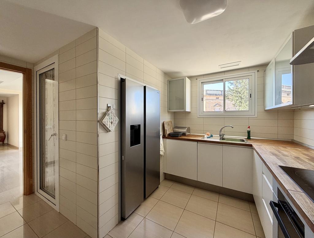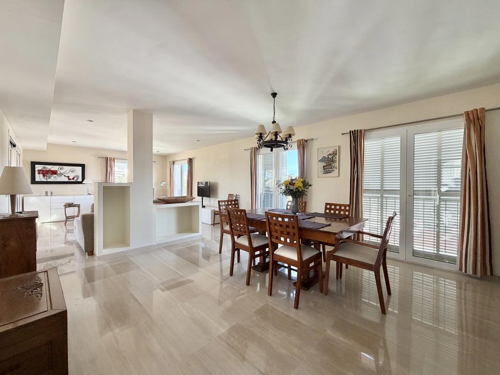 Lägenheten erbjuder ett luftigt vardagsrum med direkt access till en av terrasserna, vilket skapar en naturlig förlängning av de sociala ytorna och ett härligt inne och uteliv.