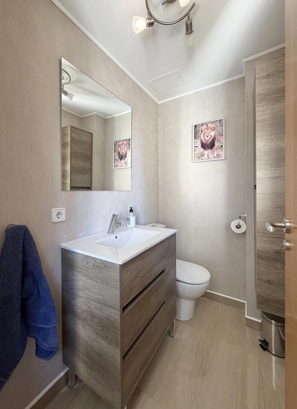 Bostaden disponeras med tre rymliga sovrum, samtliga med egna badrum (en suite), samt en separat gästtoalett – perfekt för både familj och gäster.