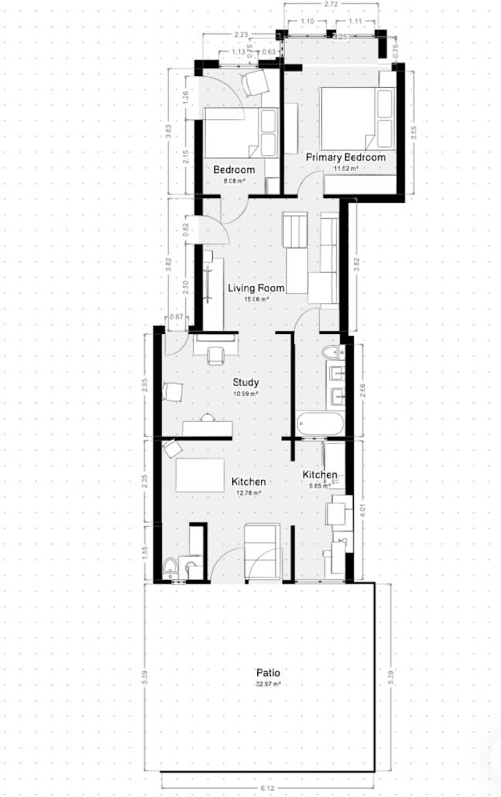 Bostaden erbjuder två sovrum, 1,5 badrum samt en generös walk-in-closet utan fönster, så rymlig att den idag rymmer en dubbelsäng. Planlösningen är öppen och social med kök och vardagsrum i fin harmoni – ett hem där rymd och ljus skapar en mycket trivsam miljö.