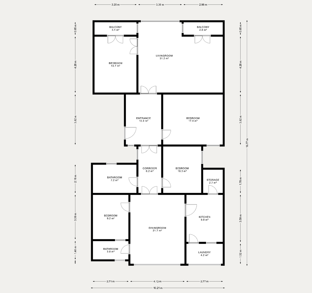 Med en byggd yta på 240 m² har bostaden 170 m² invändigt på tredje våningen med högt i tak. Njut av två ljusa vardagsrum på 31 och 21 m², ett kök utrustat med skafferi och tvättstuga, och fyra sovrum med inbyggda garderober (3 dubbelrum och 1 enkelrum), utöver två kompletta badrum.