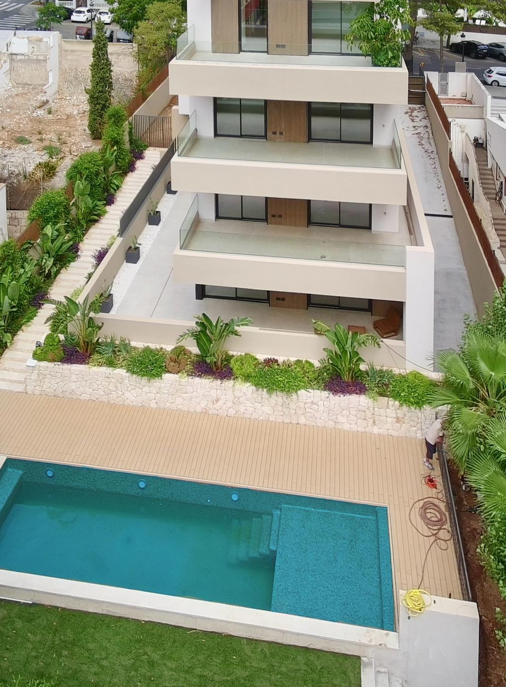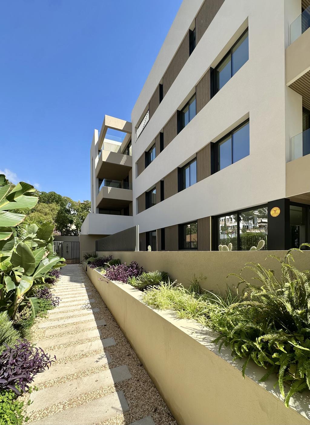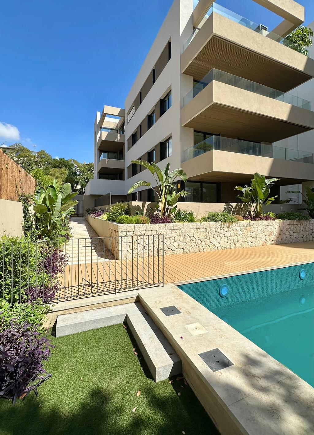 Exklusiv bottenvåning i ett nybyggt hus med stor privat uteplats & direkt tillgång till poolområdet.