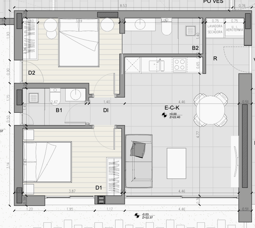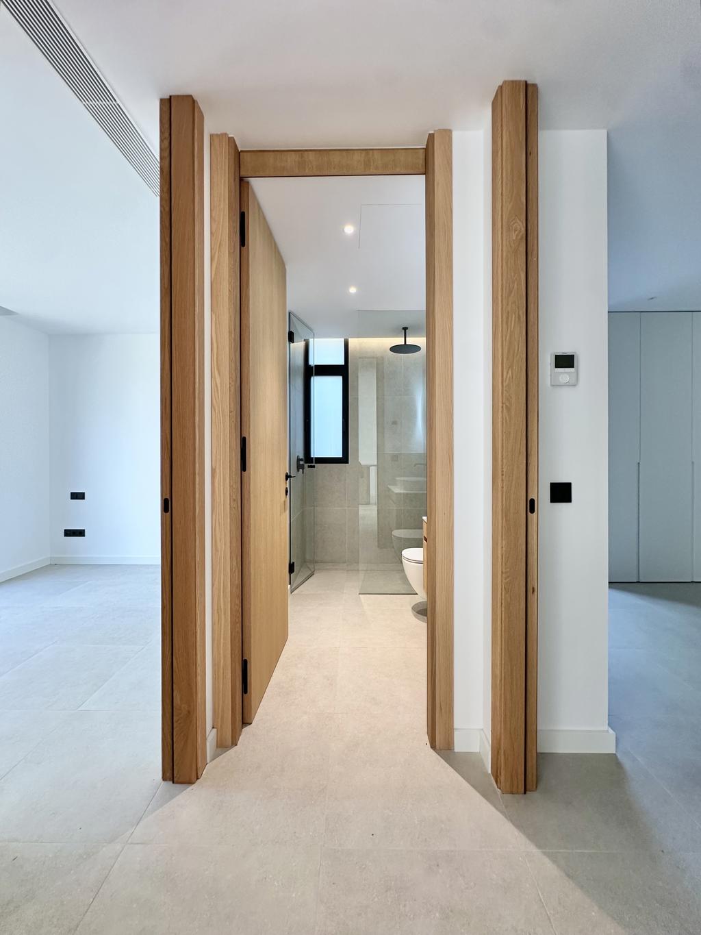 Lägenheten är 80 m2 invändigt, fördelat på två sovrum, två badrum och ett stort öppet vardagsrum/kök. Utöver detta finns en stor privat uteplats på 58 m2, som nås via vardagsrummet/köket och sovrummen. Den L-formade uteplatsen sträcker sig runt bostaden och ger känslan av en förlängning av det öppna vardagsrummet/köket.