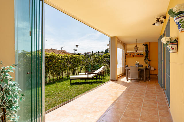 Familjevänlig lägenhet med havsutsikt, trädgård och garage i Carvajal!