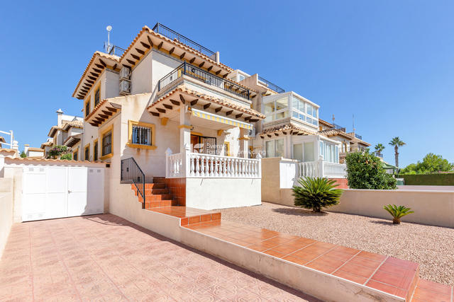 Välskött radhus med garage och flera soliga terrasser, med bästa läge i La Zenia