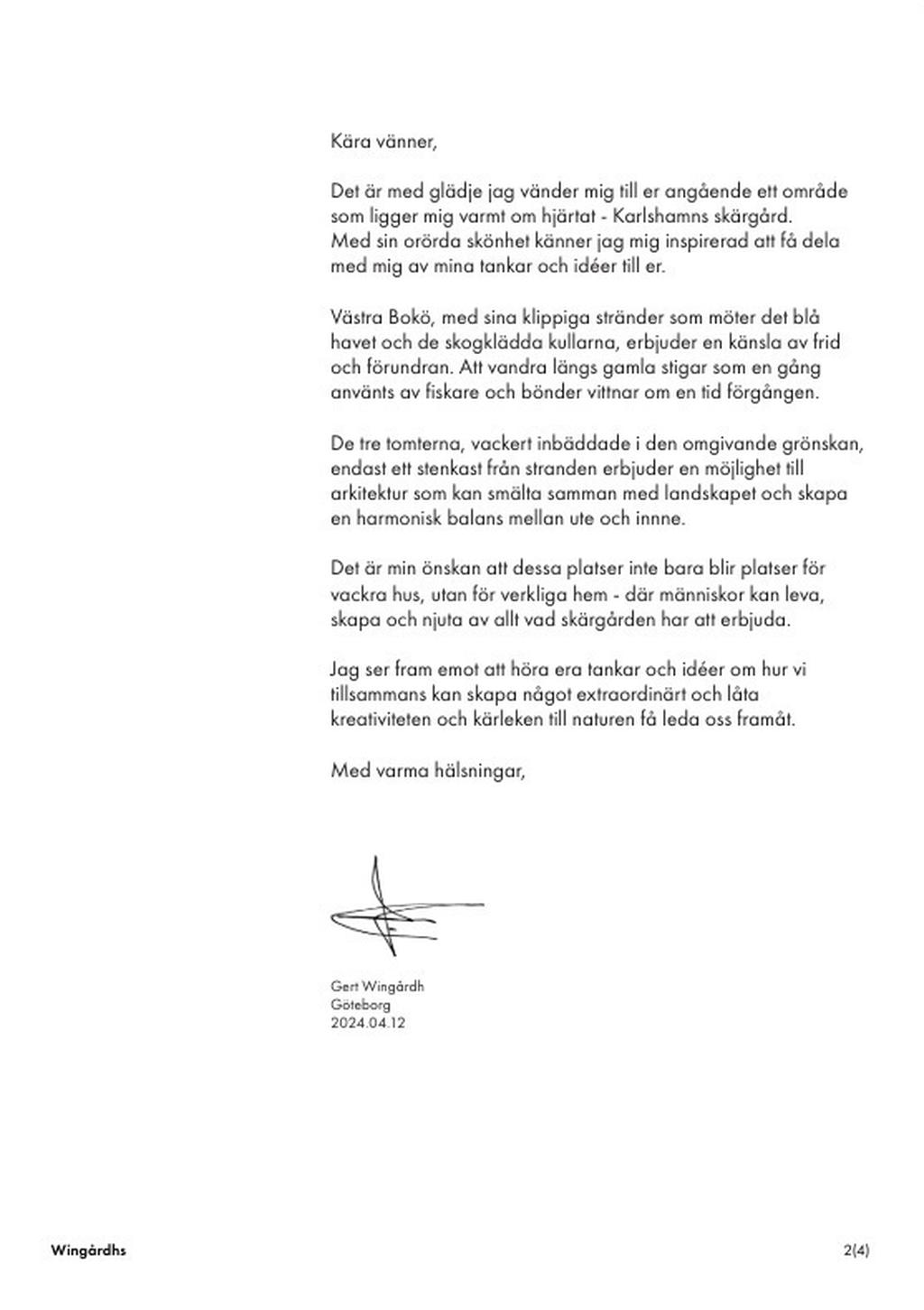 Mitt på ön erbjuds det tre fastigheter med unika förutsättningar för att kunna starta just din nästa dröm! Nuvarande fastighetsägare som även äger fastigheten omringade de tre tomterna har vänt sig till Wingårdhs arkitektbyrå för att få inspiration och professionella råd om hur man på bästa sätt ska kunna ta tillvara på allt vad miljön och tomterna har att erbjuda. Fastighetsägaren har lyckats få till ett samarbete där ett generöst erbjudande från Wingårdhs där dem erbjuder sig vara med i processen i framtagandet av ert nya boende. I försäljningskonceptet ingår en arkitektritningar framtagen av Gert Wingårdh och hans firma Wingårdhs.