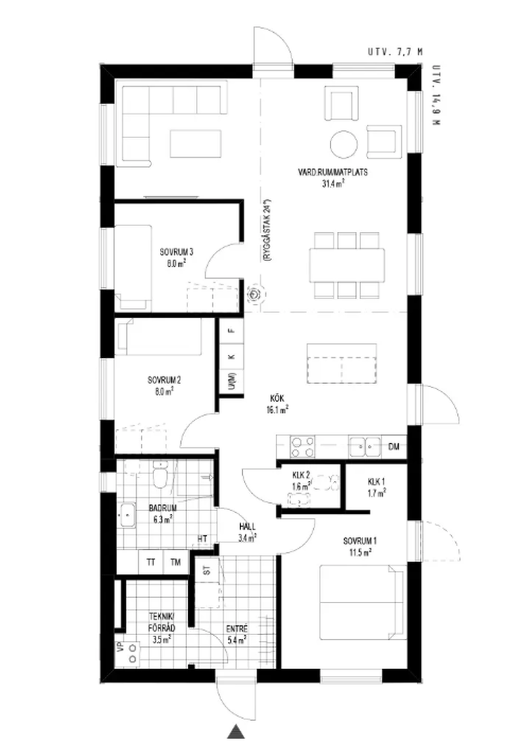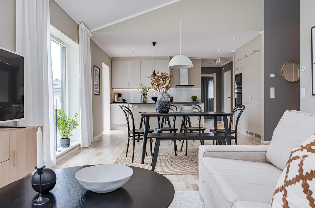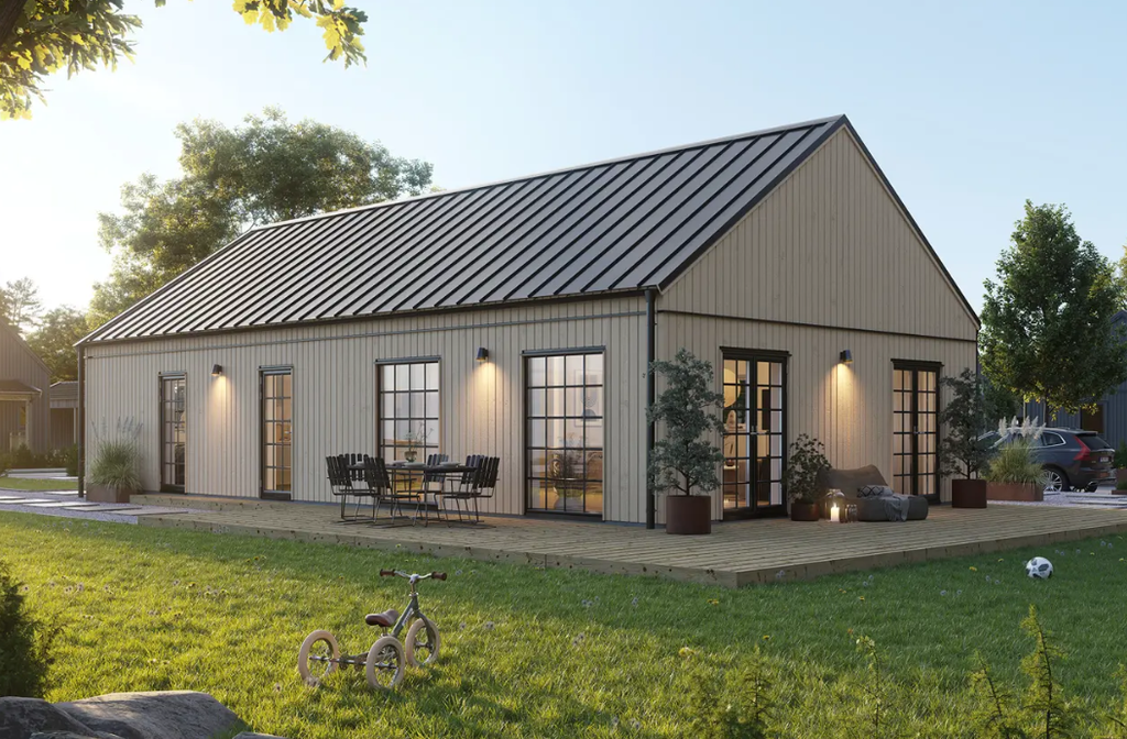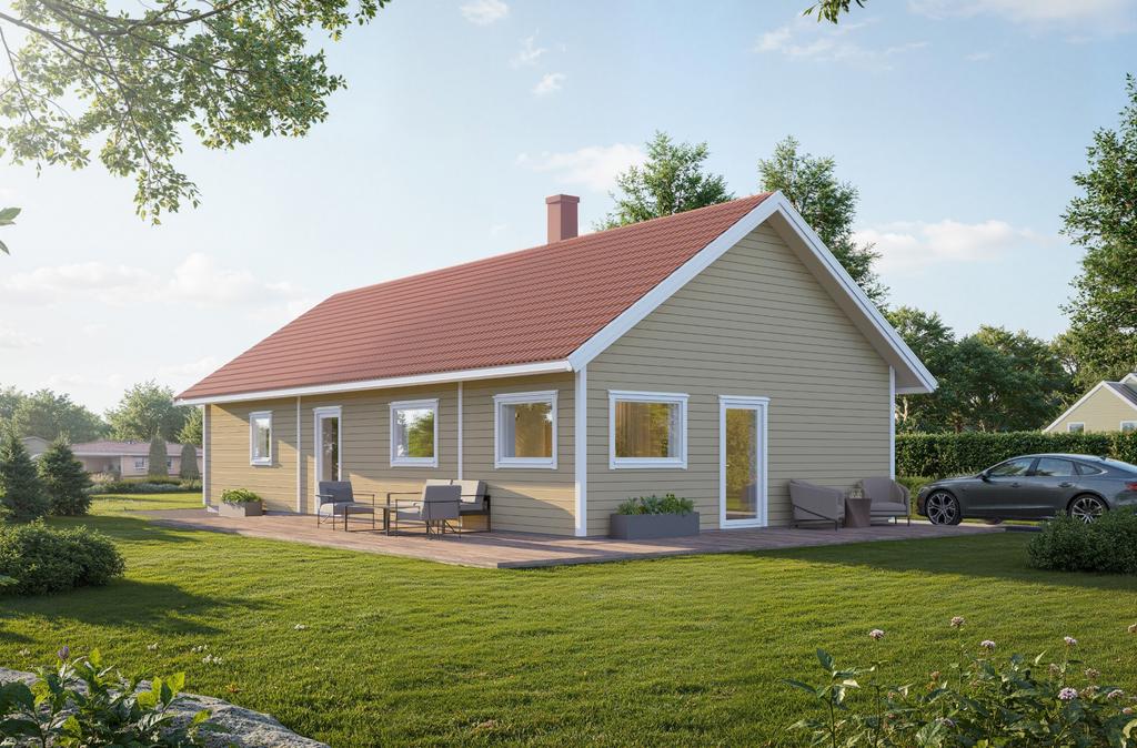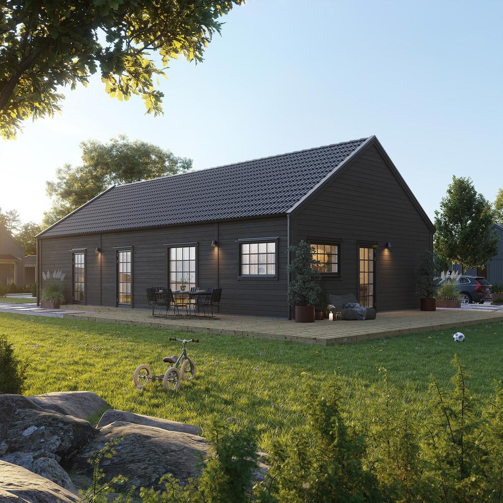På cirka 100 m² erbjuds en flexibel planlösning med möjlighet till upp till fyra sovrum, tre klädkammare samt generösa sällskapsytor med ryggåstak som skapar rymd och ljus. Huset kan anpassas efter smak och behov med val mellan både traditionell och modern stil.